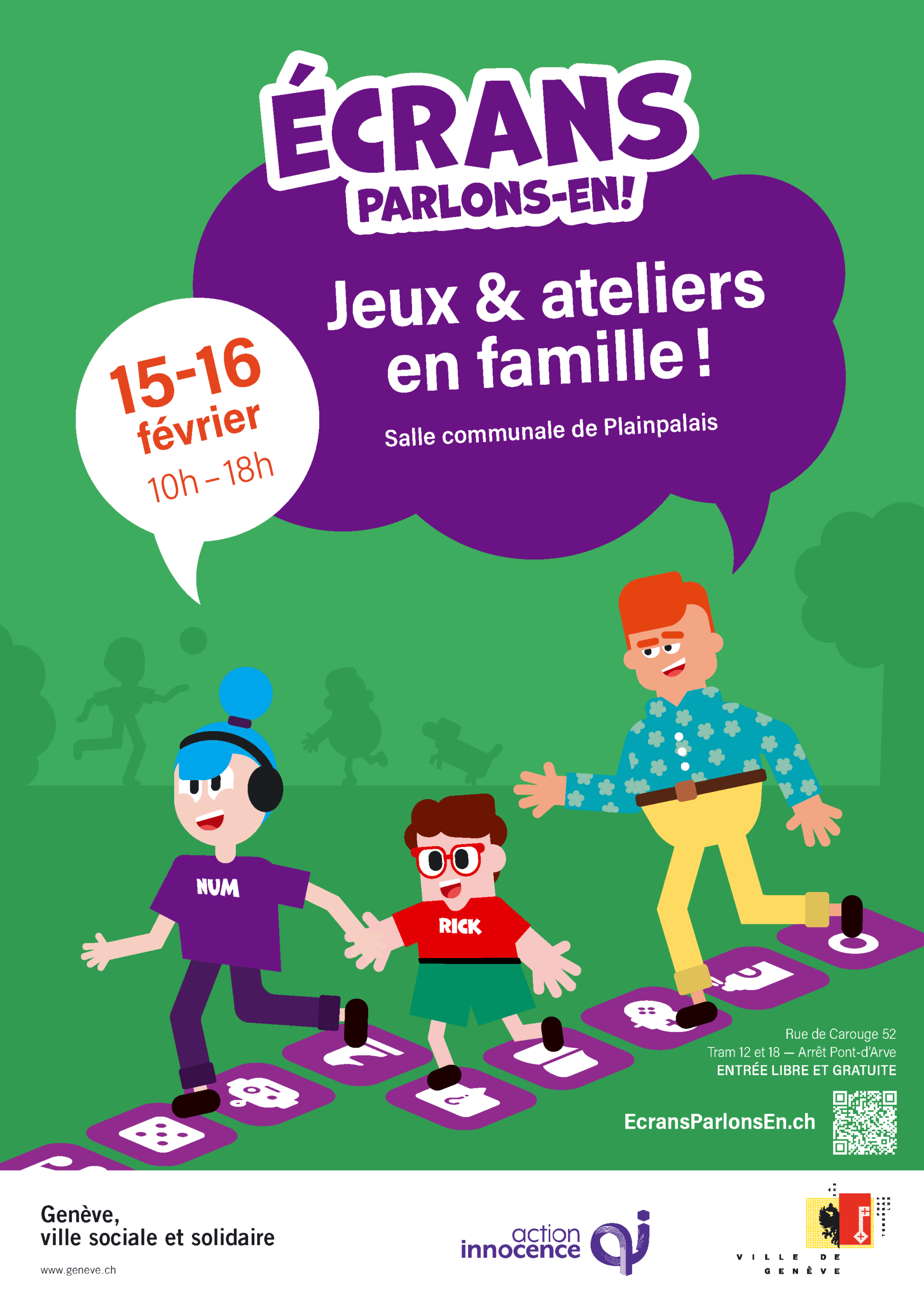 - 15-16 février 2025 – Week-end Jeux et ateliers en famille ! Plus de 3000 personnes ont répondu présent à l’invitation pour deux jours d’animations à la Salle communale de Plainpalais. Le jeu immersif Cherche et trouve géant, spécialement conçu pour l’occasion par Action Innocence, a conquis les familles, de même que l’espace questions animé par des spécialistes de la Fondation. Elles ont pu également profiter de nombreuses activités créatrices, de représentations théâtrales, ou encore de jeux vidéo.