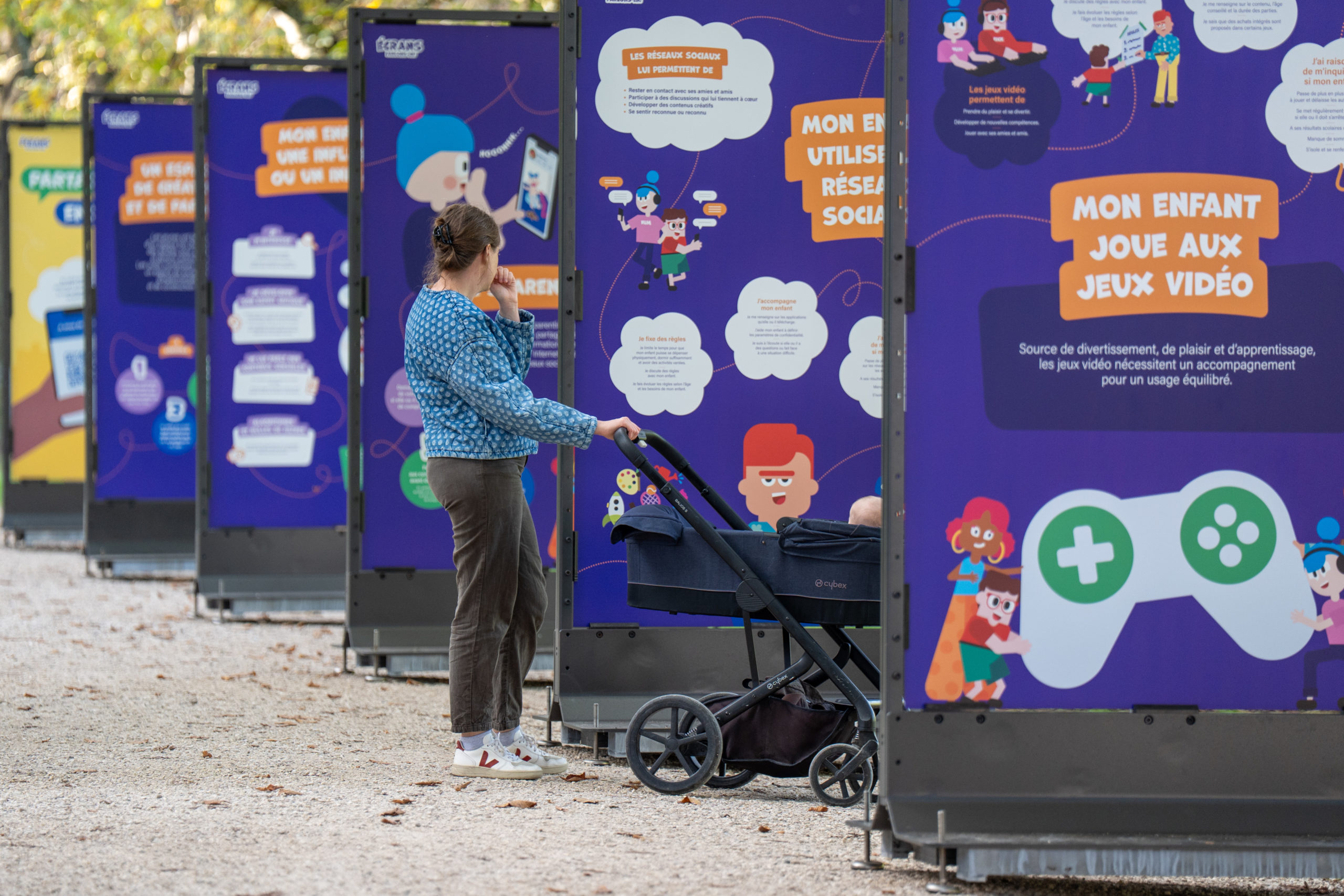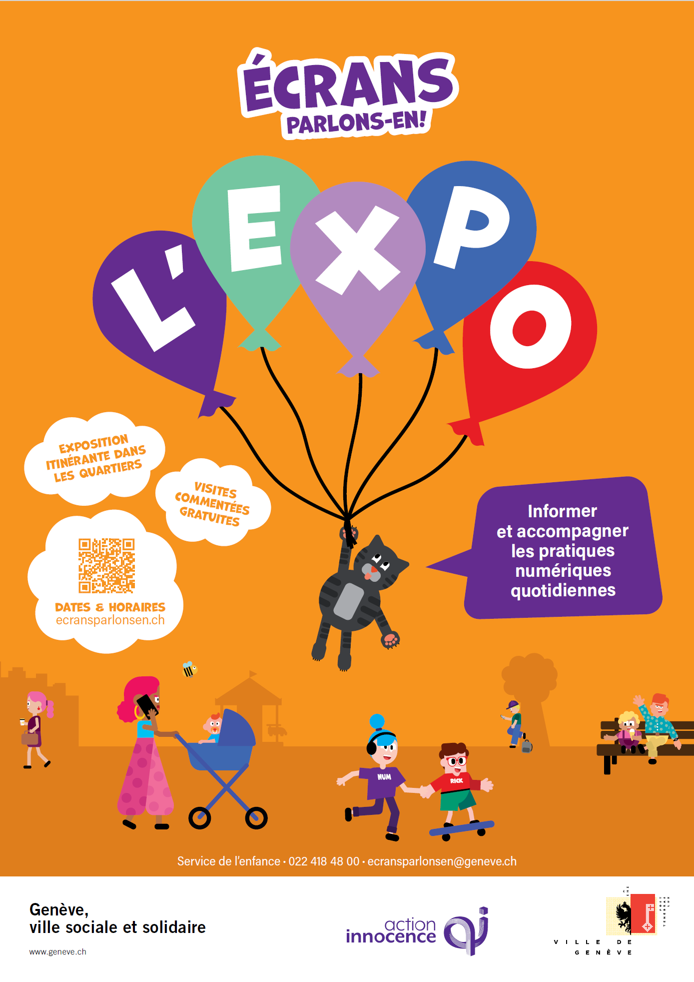 L’objectif de cette démarche est d’aborder la thématique des écrans de manière ludique et préventive. Les classes de 5P et 6P des écoles situées à proximité des lieux d’accueil auront l’opportunité de visiter le pavillon. Chaque visite, d’une durée d’environ 1h30 par classe, permettra aux élèves de s’informer et d’échanger autour des pratiques numériques. Dans le cadre de la campagne, la tournée des préaux a débuté à l’école de Saint-Jean en mai 2025 et se poursuivra jusqu’en mai 2026. Le pavillon ira ensuite à la rencontre des élèves de 5P et 6P du canton de Genève jusqu’en juin 2028. - Dès le mois d’octobre 2025 – Une exposition itinérante se déplacera dans les quartiers de la Ville de Genève, à la rencontre des enfants, des jeunes et des parents. Construite autour de 20 visuels attractifs, elle a pour objectif d’éveiller la curiosité et de favoriser l’échange.