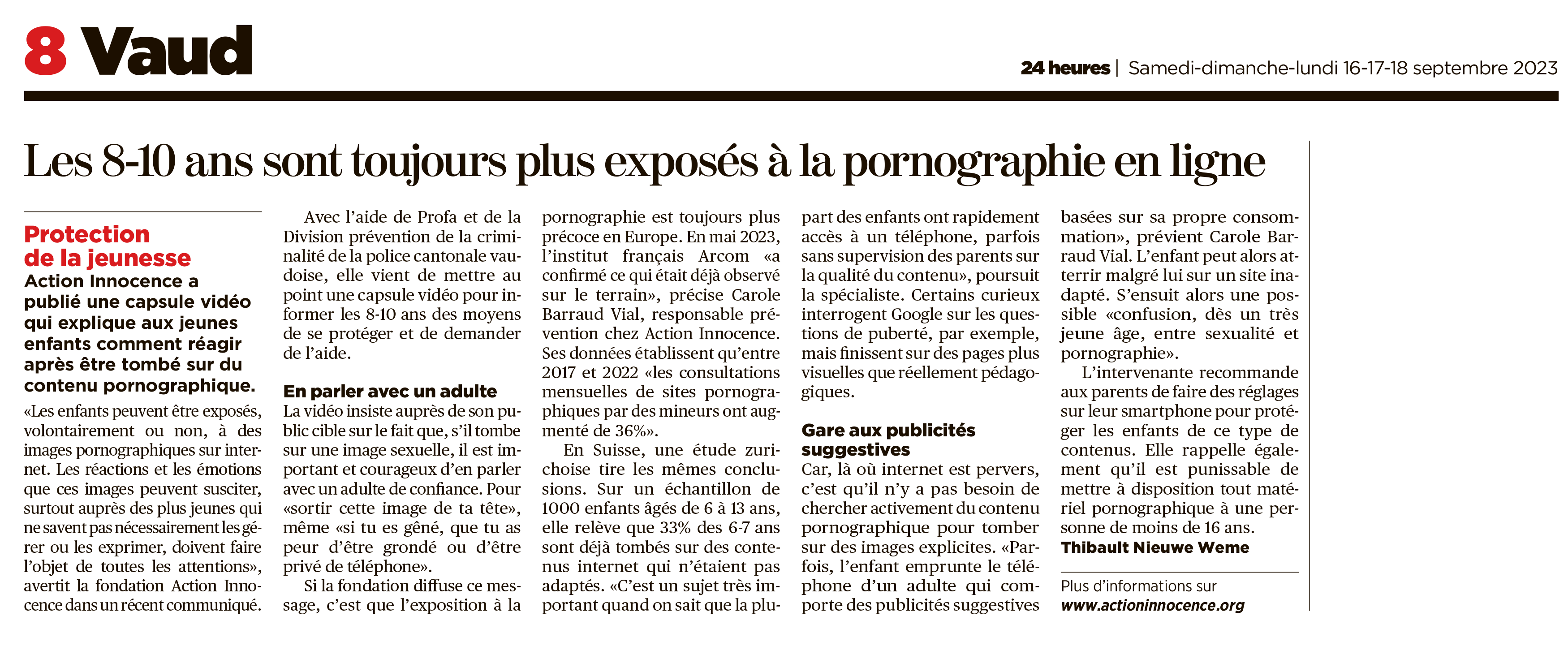 - Les 8-10 ans sont toujours plus exposés à la pornographie en ligne, 24 Heures, 16 septembre 2023