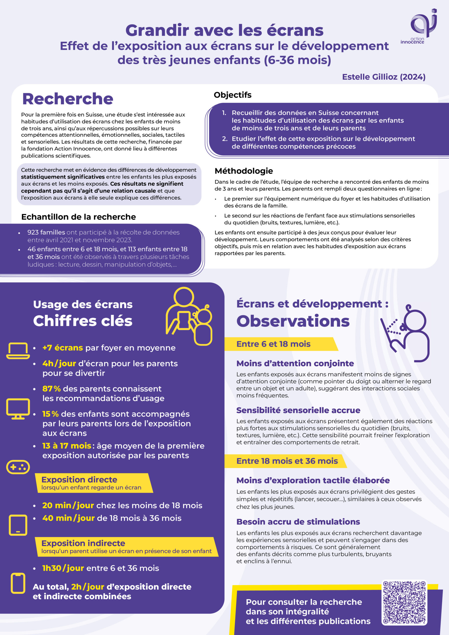 L’étude a été menée par la Dre Estelle Gillioz, responsable du Pôle Recherche d’Action Innocence, dans le cadre de sa thèse de doctorat en psychologie soutenue en décembre 2024 à l’Université de Genève. L’ensemble des résultats, rendus sous formes d’articles scientifiques, permettra à la Fondation de développer des outils de prévention adaptés, à destination des professionnel·le·s de la petite enfance ainsi qu’aux parents et futurs parents.